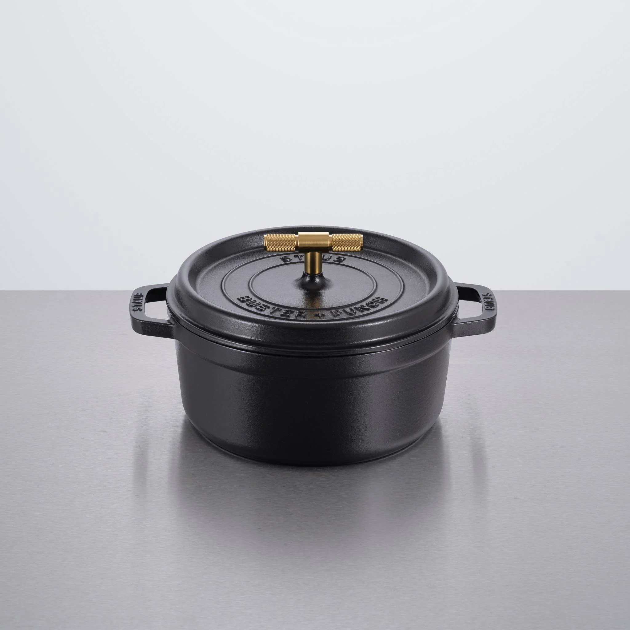 A black cast iron cocotte featuring a signature Buster + Punch T-bar handle with diamond-cut cross knurling for enhanced grip and control during use. Refined by hand and designed to match seamlessly with Buster + Punch kitchen detailing and collections. Available in steel and brass finishes. A Staub collaboration product.