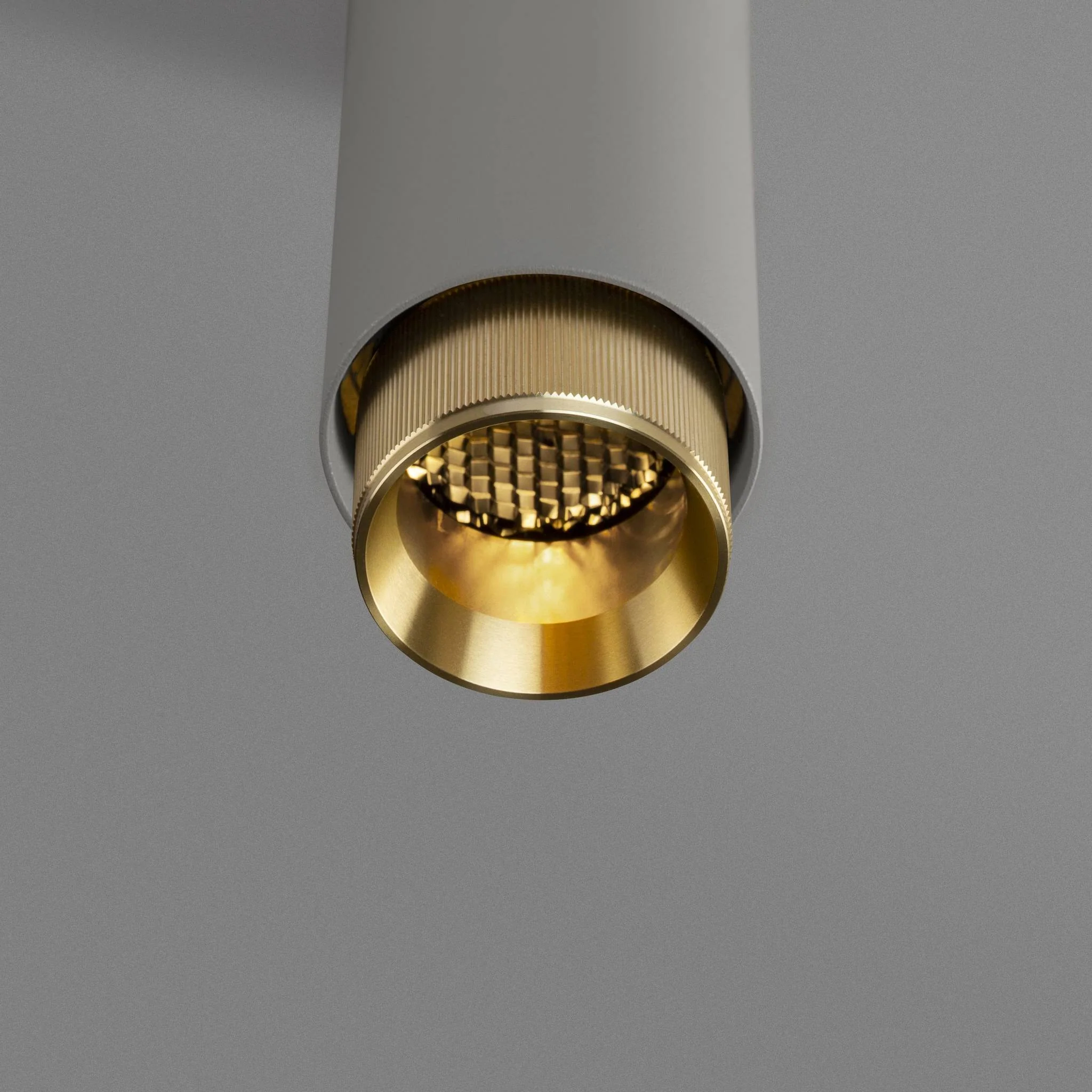 A pendant spotlight with a powder coated metal body and solid metal detailing. The pendant features our signature solid metal linear-knurl baffle and machined screws. The baffle captures light and creates a delicate metallic glow, whilst a honeycomb filter delivers a precise, low-glare, directional light. This spotlight fits a GU10 bulb, sold separately.