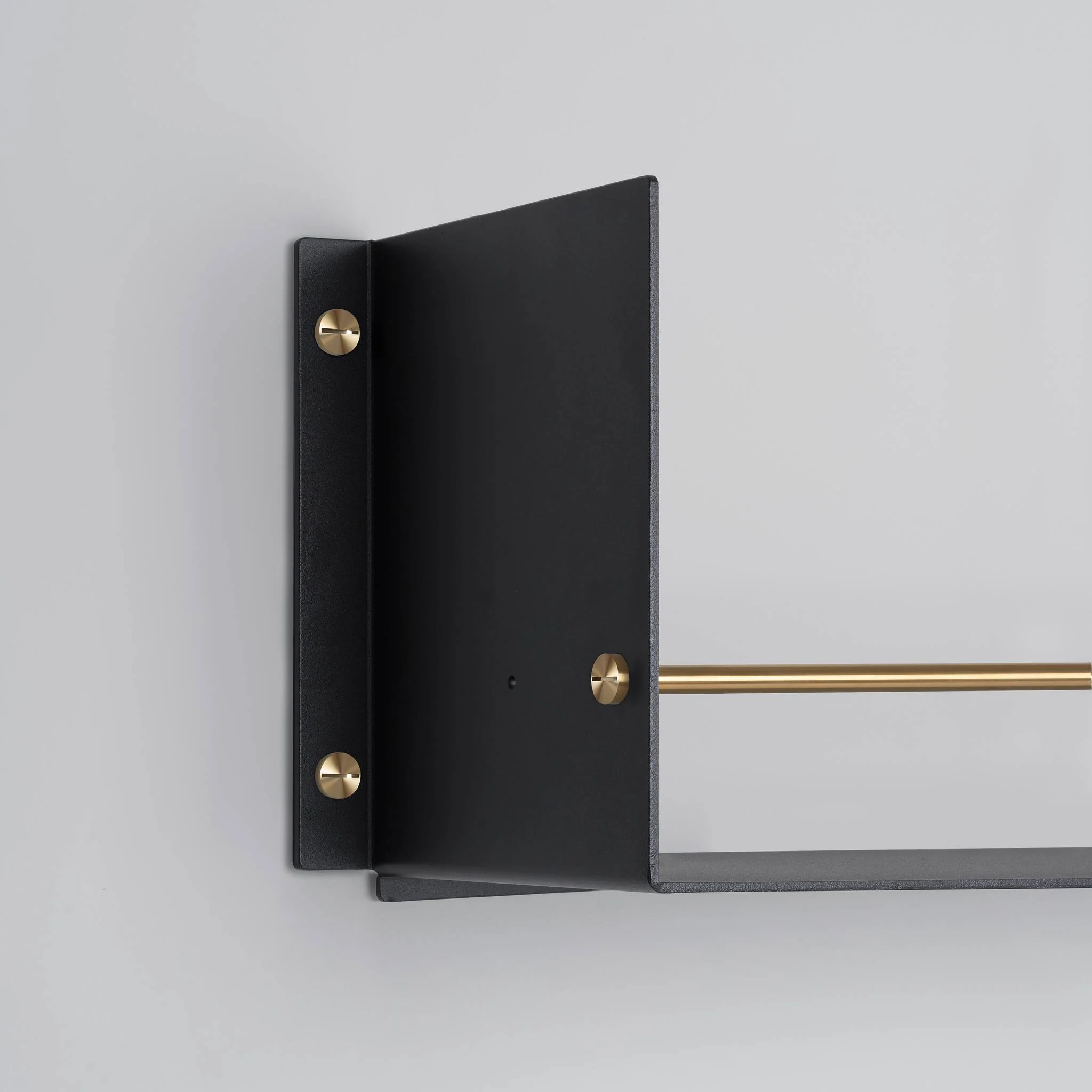 A heavy-duty shelf made from laser cut 4mm/0.15" sheet aluminium, press bent into shape and powder coated. The shelf features a hand polished, 12mm/0.47" hand polished solid metal rail and is finished with matching Buster + Punch coin screws.