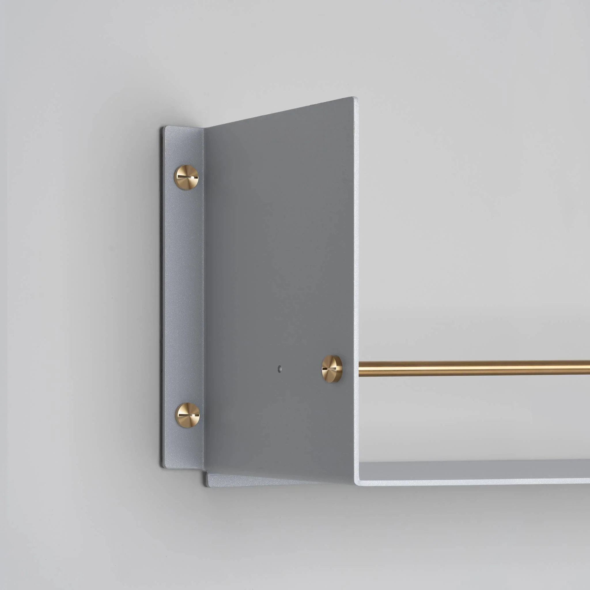 A heavy-duty shelf made from laser cut 4mm/0.15" sheet aluminium, press bent into shape and powder coated. The shelf features a hand polished, 12mm/0.47" hand polished solid metal rail and is finished with matching Buster + Punch coin screws.