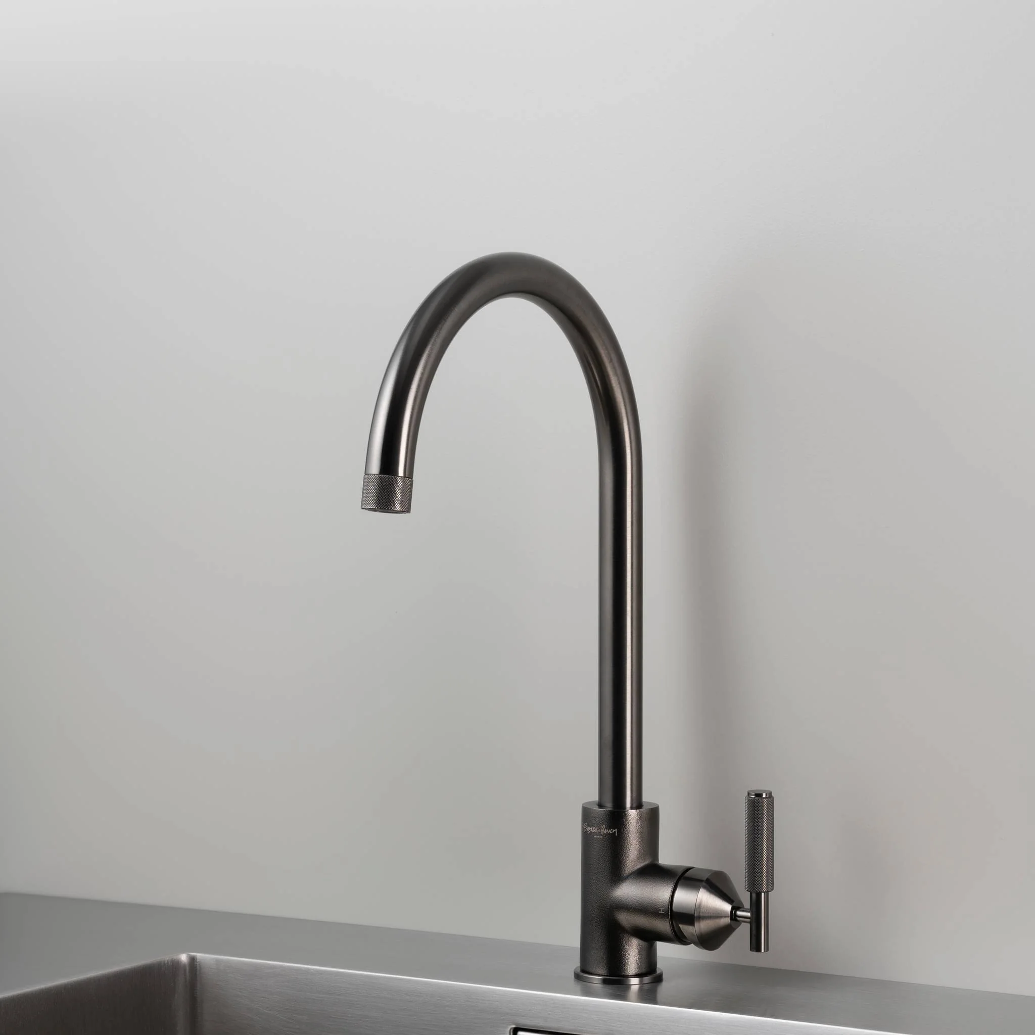 A kitchen tap with single lever mixer. This tap has been cast, sand-blasted and machined from solid metal in Italy. It features our signature cross-knurl pattern and is refined by hand.